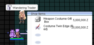 The Wandering Trader has 1 random box weapon costume box for 5mil and 1 specific weapon costume for 20mil every 30 minutes. Once the 1 item is sold out, the item will become greyed out. When it is in stock, there will be a 1 under the items icon.