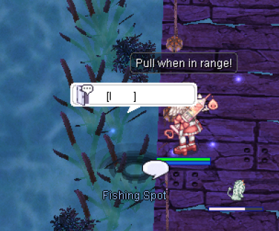 A chat will appear above the Fishing Spot. The goal for catching is to click the Fishing Spot when the | is between the brackets [ ]. You must click it a few times inbetween the brackets until the text reads [|] with no spaces.